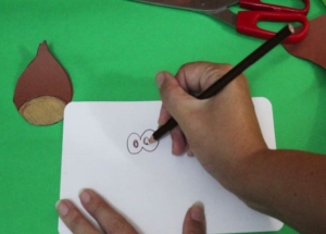 Su un cartoncino marrone disegniamo una castagna e creiamo anche la sua parte più chiara con un cartoncino beige o se preferiamo la coloriamo soltanto con un pastello marroncino chiaro. La ritagliamo.