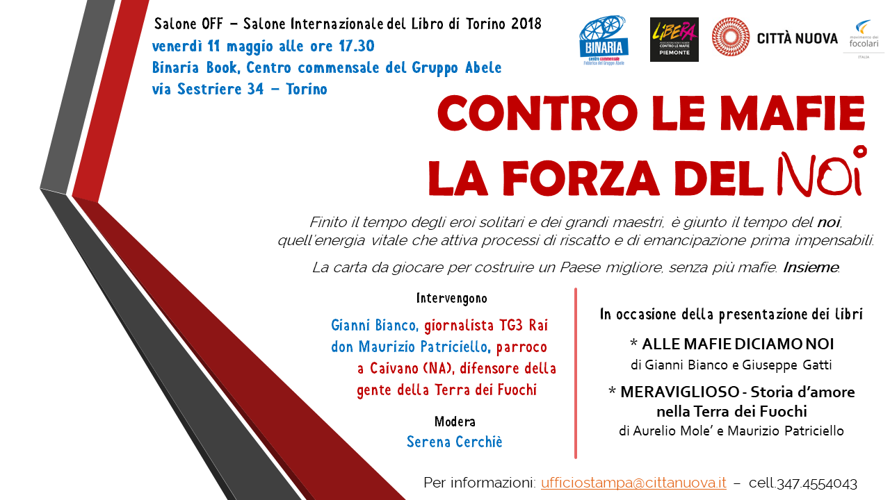 Nell’ambito del Salone Off del Salone internazionale del Libro di Torino 2018, venerdì 11 maggio alle ore 17.30 in Via Sestriere 34 si svolgerà un evento con il giornalista Rai Gianni Bianco. In occasione della presentazione del libro Alle mafie diciamo noi. L’appuntamento è promosso dalla Comunità dei Focolari di Torino, Città Nuova, Libera Piemonte, Binaria Centro Commensale, Gruppo Abele.