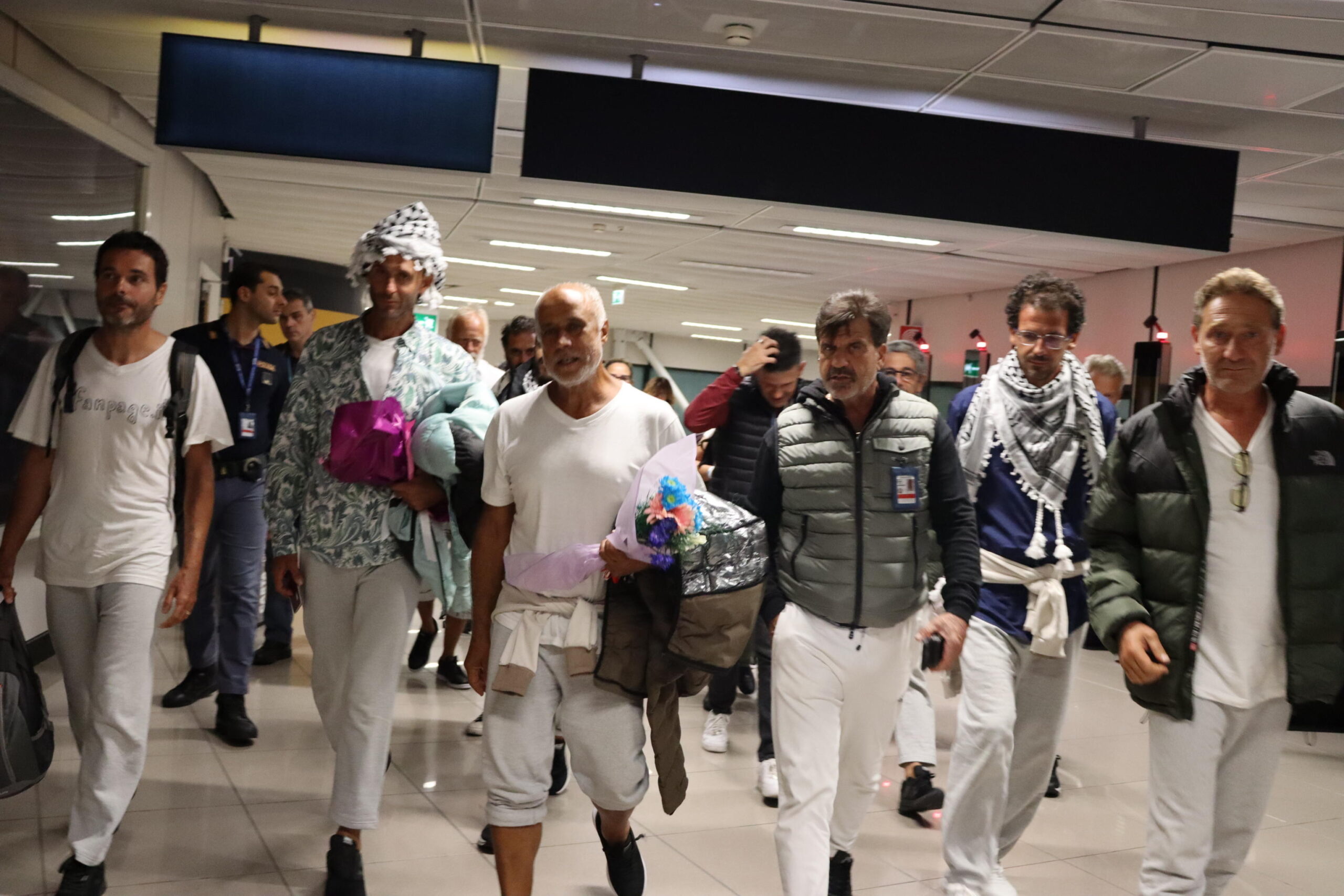 Un gruppo di 18 italiani dei 26 totali rilasciati dalle Autorità israeliane che facevano parte della Global Sumud Flotilla è arrivato verso le 23.30 all’aeroporto di Fiumicino con un volo della Turkish Airlines, 04 ottobre 2025.