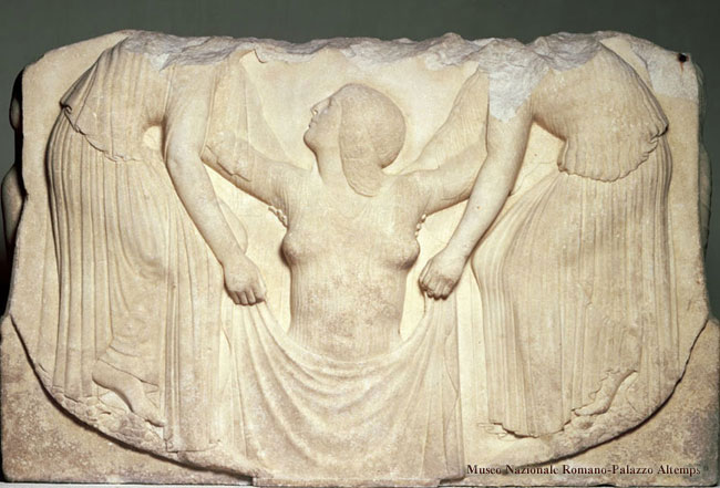 Sulla fronte del rilievo una giovane donna indossante un chitone ionico trasparente, identificata come Afrodite mentre nasce dal mare o compie il suo lavacro rituale, viene sollevata da due figure femminili chine su di lei: scena di estrema compostezza e armonia, nell’intreccio delle braccia e nei panneggi che disegnano le membra; tutta intrisa di luce e di acque, che ben rendono il clima gioioso – e di miracolo – di una nascita o di una rinascita.