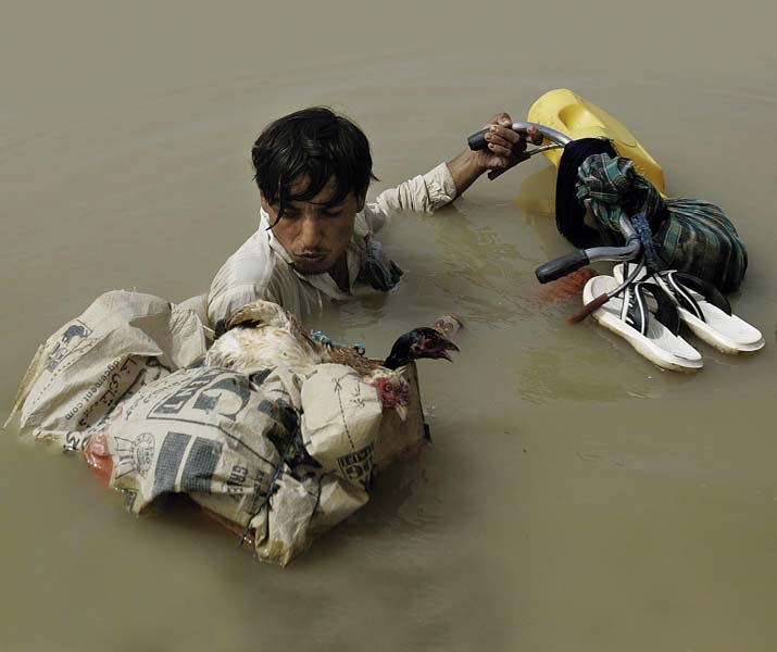 Non è un fiume ma un campo allagato questo che il giovane pakistano tenta di attraversare con una bicicletta su cui ha caricato il suo tesoro scampato all’alluvione. Non sapremo mai se ce l’avrà fatta.