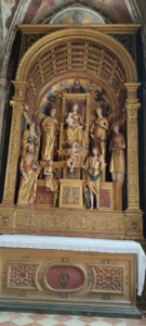 Sono figure schiette, dai gesti essenziali, dipinte a bei colori forti non invadenti con un Eterno benedicente in alto dipinto sotto l’arcata del trono mariano. C’è una gran bella decorazione dorata nell’altare, che dà luce: se venisse pulita – l’ultimo restauro è del 1965!- risplenderebbe ancora di più. Un linguaggio divulgativo in definitiva, piacevole e “normale”. La bellezza delle cose semplici, spontanee.