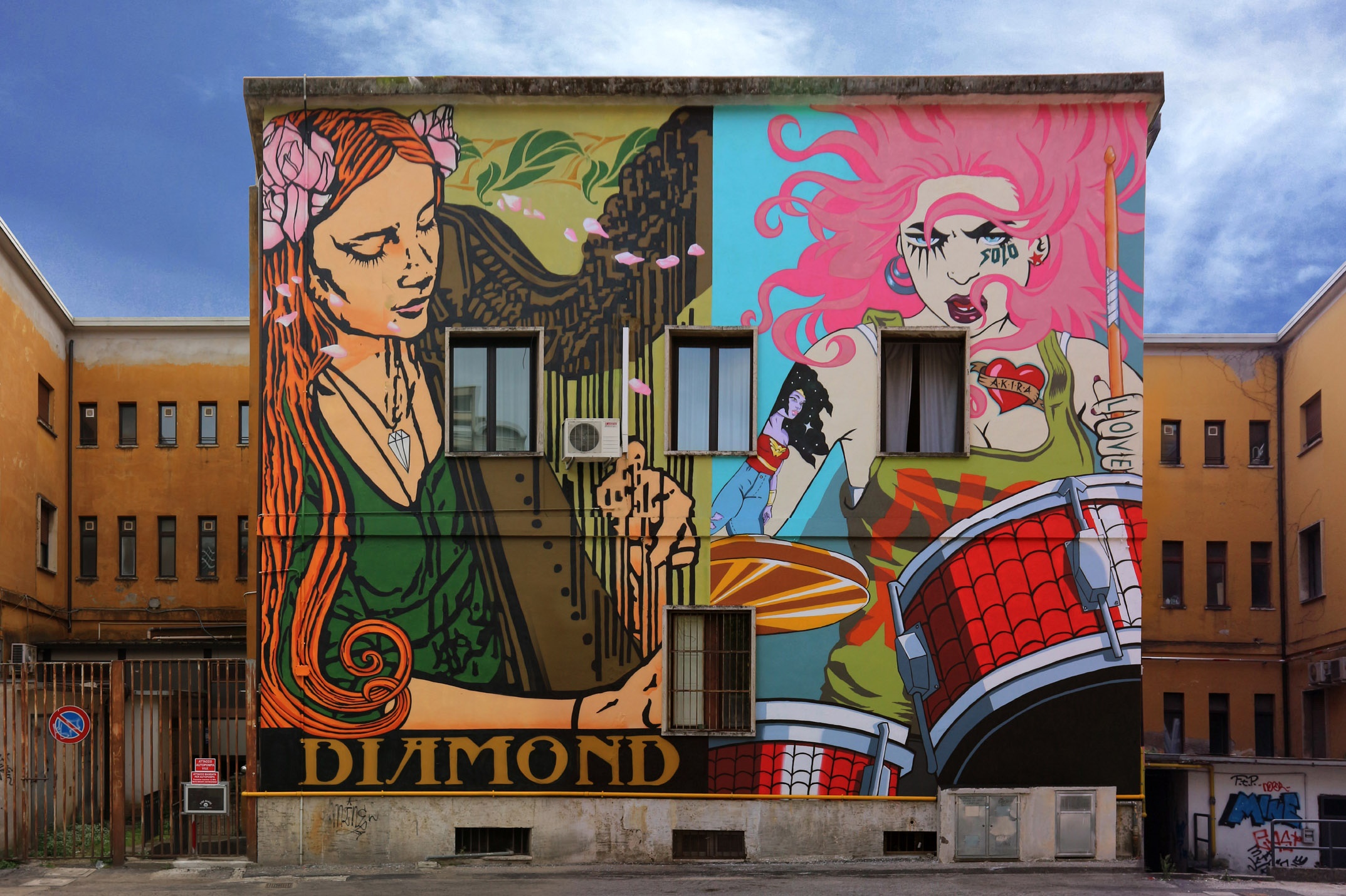 S’intitola “Allegro ma non troppo, concerto per arpa e batteria”, una metafora che armonizza in un’unica immagine due strumenti molto diversi. Metafora che vuole essere un inno alla libertà di espressione attraverso la raffigurazione di anime diametralmente opposte di uno stesso diritto alla libera scelta. Il murales degli artisti Diamond e Solo che campeggia sulla facciata del palazzo del sindaco della cittadina di Cassino, nel frusinate, fa parte delle 9 nuove opere murarie della prima edizione di Street Art for Rights, un progetto di arte urbana che si è prefisso di creare un museo a cielo aperto in due quartieri della periferie di Roma – Settecamini e Corviale – e in alcune cittadine del Lazio – Cassino e Latina –. Ideatori e curatori Peppe Casa e Oriana Rizzuto.