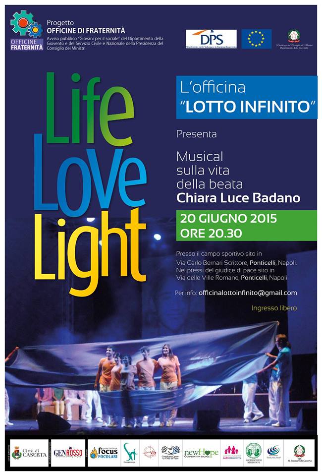 Tra queste “Lotto Infinito”, che da oltre cinque mesi è diventata un punto di riferimento importante per i partecipanti e per la comunità del luogo, un seme di speranza e un segno di positività per chi crede nell’esempio e nel messaggio di figure importanti. Proprio come Chiara Luce Badano, la giovane del Movimento dei Focolari stroncata a 18 anni da un tumore osseo e dichiarata beata nel 2010, dopo che Papa Benedetto XVI ne riconobbe l’eroicità delle virtù e l’attribuzione di un miracolo. Una ragazza tenace, “fuori dagli schemi”, attenta agli ultimi e pronta a sacrificarsi per loro, che molto presto sperimentò la sofferenza ma non smise di amare e prodigarsi per gli altri. Un modello di santità che tutti potranno scoprire, vivere e rivivere in «Life Love Light», questo sabato, 20 giugno, quando i ragazzi dell’officina di Ponticelli si trasformeranno in attori, musicisti e cantanti per donare dal palco un messaggio di speranza e un esempio di vita. Allo spettacolo assisteranno anche monsignor Lucio Lemmo, vescovo ausiliare della città di Napoli; e Alessandra Clemente, assessore alle Politiche giovanili, Innovazione e Creatività del Comune di Napoli.