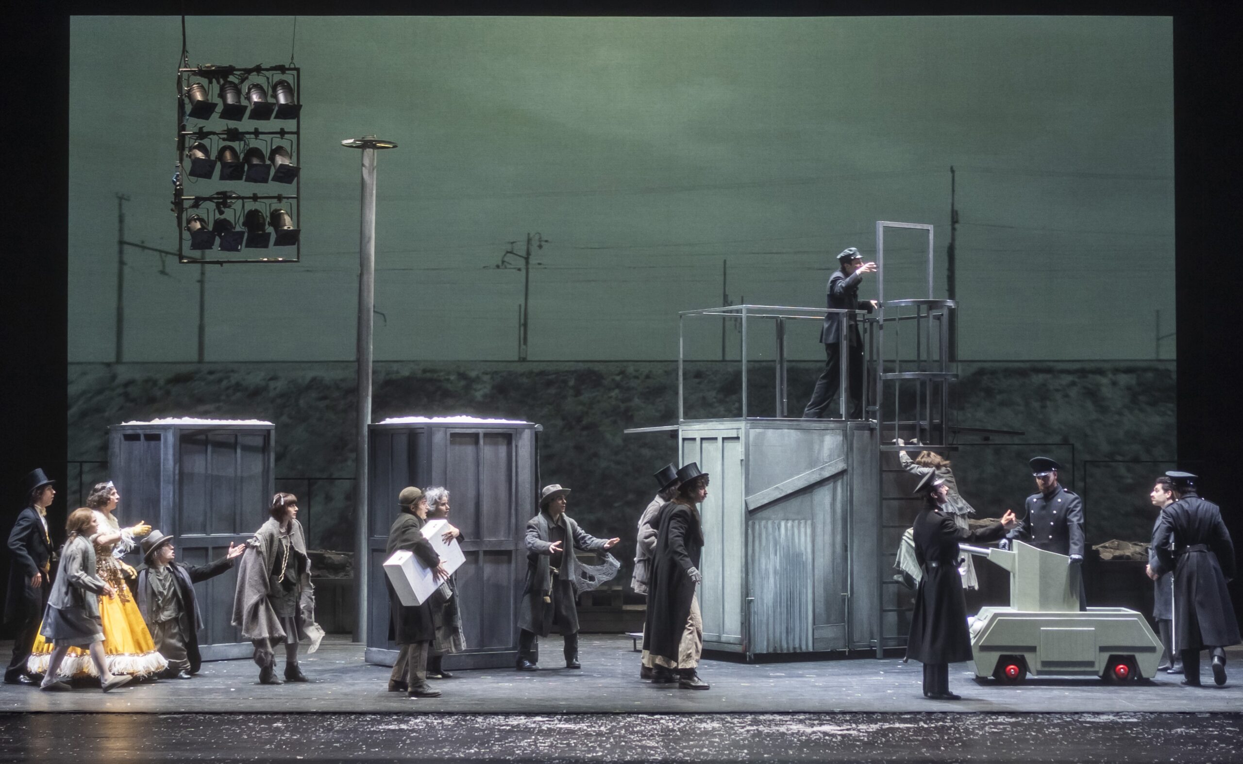 A ricreare, tra nebbia e solidarietà, quella Milano della fiaba filmica recitata in gran parte in dialetto e alternando il racconto in terza persona, sono una complessa e funzionale scenografia mobile di baracche e arredi, e un susseguirsi di sequenze dinamiche e visive con echi al varietà musicale, a un album di personaggi bizzarri, di oggetti e di immagini – un’annunciatrice radiofonica, donne dalle parrucchiere, alle prese con la lavatrice, le riviste di moda, Nilla Pizzi che vince a Sanremo, le prime alla Scala con la voce di Maria Callas – che restituiscono il clima storico e culturale dell’epoca. Uno spettacolo, in definitiva, dai toni brechtiani, cari a Longhi, con tutta la questione sociale che suscita confrontando le fragilità dell’Italia di ieri e quella di oggi in tema di periferie, e dove non mancano rimandi e citazioni culturali all’italianità, a partire dalle movenze di Guanciale del mitico Totò principe Antonio De Curtis, al romano Trilussa, al romagnolo Fellini, e ancora Zavattini, l’Arlecchino di Strehler, per finire con Giovanni Testori, cantore critico e devoto di Milano. Spettacolo di grande coralità, dicevamo, che ha il suo zoccolo duro nel fedele gruppo di attori che lavorano con Longhi: oltre a Guanciale, Sara Putignano, Mauro Pirello, Michele Dell’Utri, Diana Manea, Giulia Trivero, Daniele Cavone. A riempire le fila un’intera classe di allievi della Scuola del Piccolo.