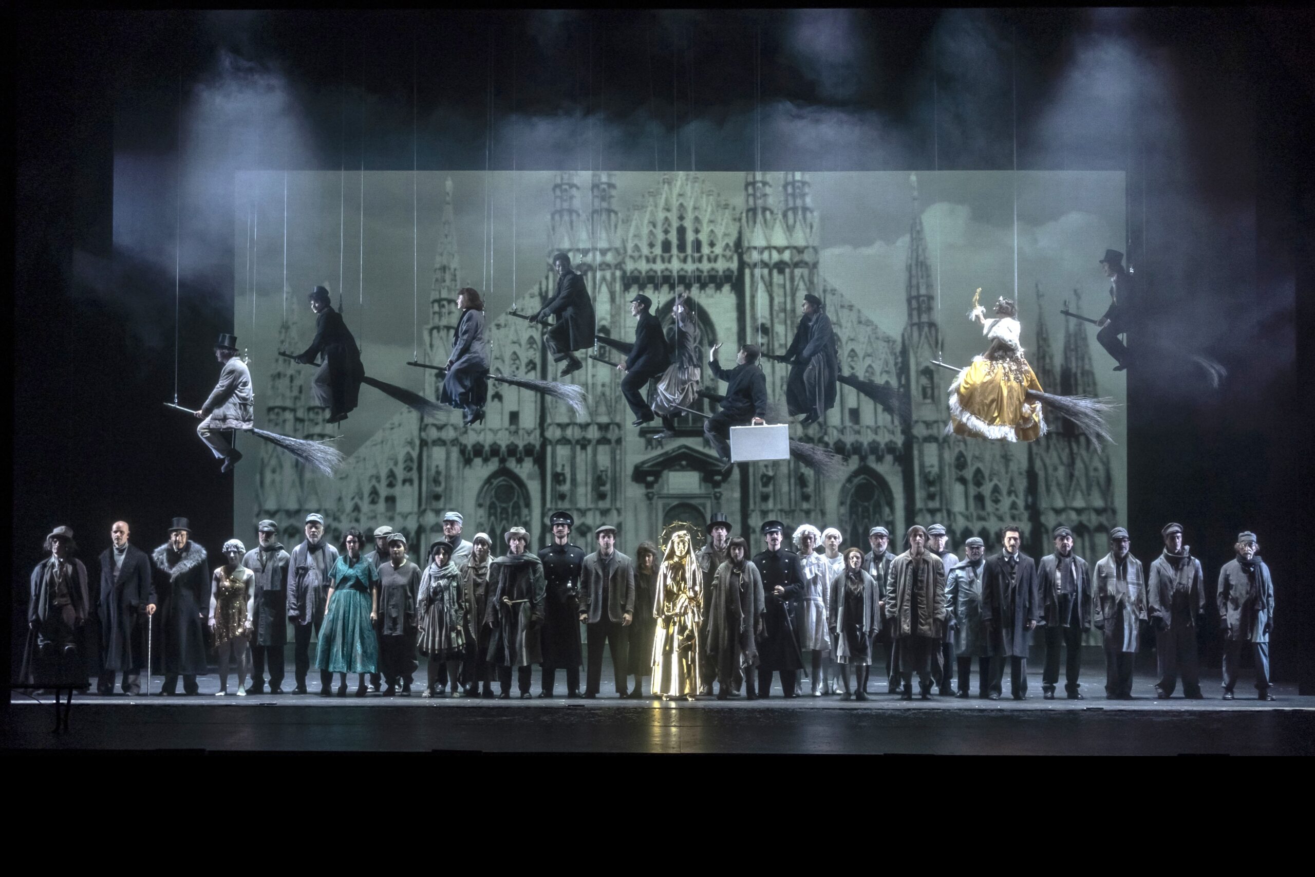 Verso dove viaggeranno quei “poveri Cristi”, quella massa di diseredati, tutti felici in sella a delle scope che si alzano in volo dalla grande piazza sovrastando la magnificenza del Duomo di Milano con in cima la sua “bela Madunina”? Verso un futuro migliore, un mondo più bello, più giusto? Ieri come oggi inseguendo il sogno, l’utopia di sempre, e di tutti, davanti alle ingiustizie, ai soprusi, alle vessazioni, che non hanno fine? Spereranno di andare verso un paese «dove buongiorno vuol dire davvero buongiorno»? Quel volo sospeso, un coup de théâtre, è la scena che chiude Miracolo a Milano, spettacolo di punta della stagione del Piccolo Teatro con la regia di Claudio Longhi e una schiera di interpreti, 44 in tutto, con al centro un instancabile, energico, Lino Guanciale (anche dramaturg insieme a Paolo di Paolo) e una tenerissima, minuta e luminosa novantaduenne Giulia Lazzarini. Un’autentica sfida – decisamente vinta – trasporre dallo schermo alla scena un capolavoro cinematografico del neorealismo qual è stato, e rimane, il film omonimo di Cesare Zavattini e Vittorio De Sica, che all’uscita, nel 1951, suscitò accese discussioni, critiche e polemiche. Oggi è tutt’altra storia. E al Teatro Strehler è grande successo.