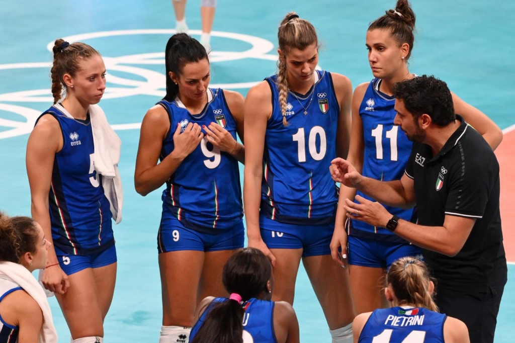 L’allenatore Davide Mazzanti con la squadra azzurra di pallavolo femminile durante i Giochi Olimpici di Tokyo 2020, 2 agosto 2021 (Photo Alfredo Falcone/LaPresse)