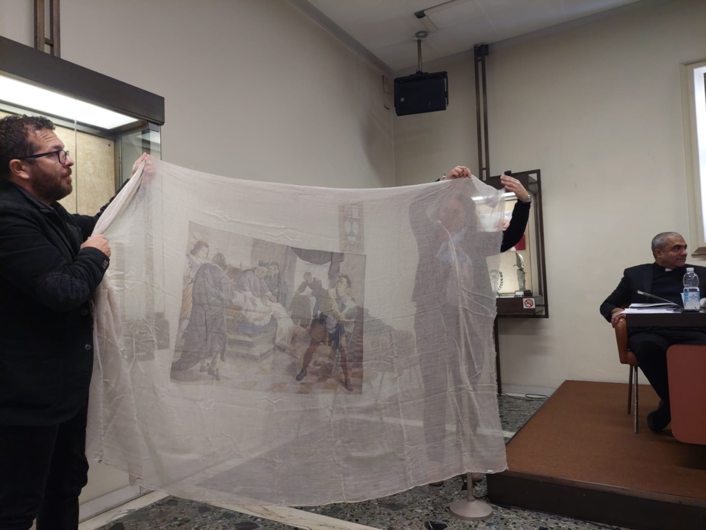 Foulard di Brunello Cucinelli con l’immagine della spogliazione di san Francesco. Foto: Candela Copparoni