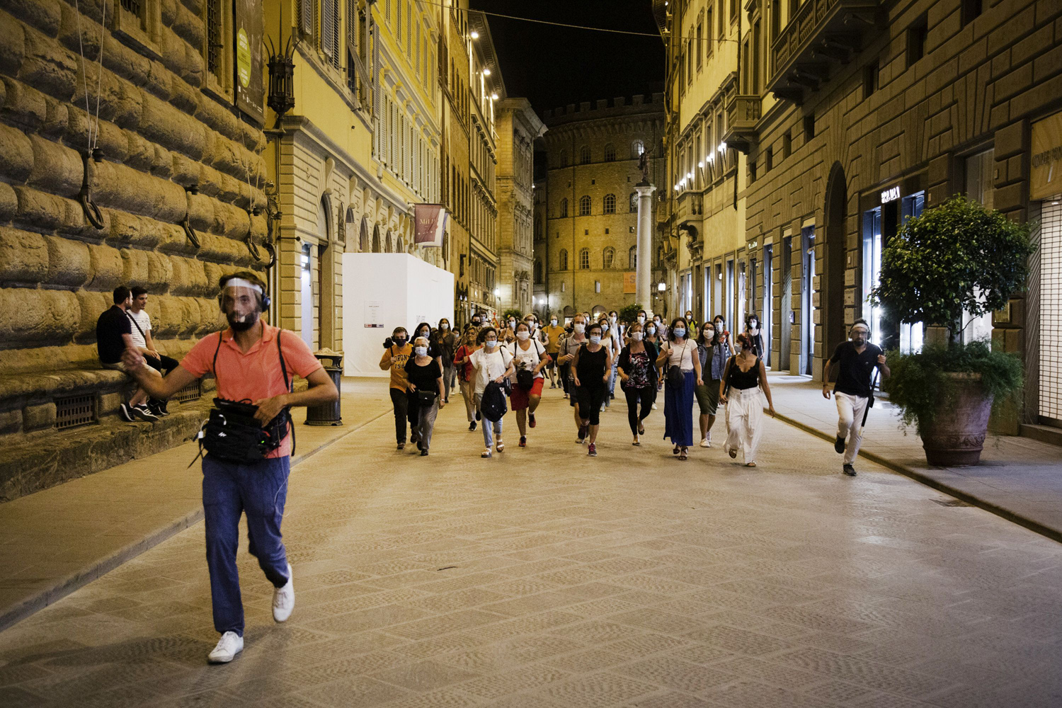 Metti una caldissima sera d’estate. Metti che si è in una delle città più belle al mondo, Firenze. Metti che, muniti di audiocuffie che isolano dal contesto urbano e dalle quali si odono solo le voci delle guide, ci si trovi a condividere con un gruppo di 40 persone una insolita passeggiata, diversa dai consueti progetti urbani di teatro itinerante tanto in voga. Metti che si è condotti da una coppia di attori – Gregory Eve e Luca Avaglino – perfetti per empatia, simpatia e bravura, assurti al ruolo di traghettatori, come moderni Dante e Virgilio, per le vie della città, assimilabili a una sorta di “pifferai magici”. Metti tutto questo, e molto altro ancora di sorprese lungo il tragitto cha va dalla Casa di Dante a Piazza della Signoria e Piazza Strozzi passando per stradine e vicoli, e avremo Walking Therapie.