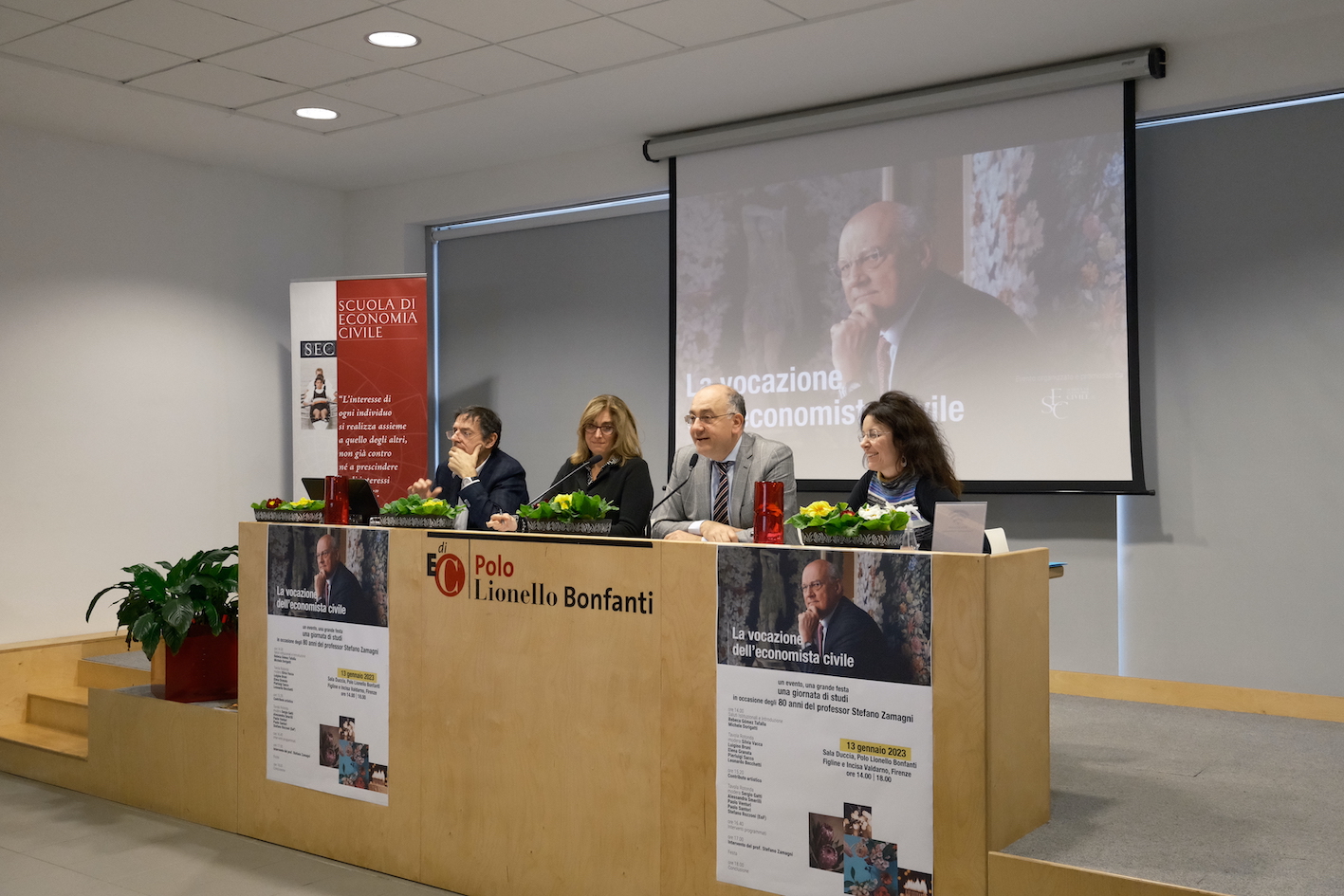 “La vocazione dell’economista civile” era un titolo su misura per un tale appuntamento, promosso il 13 gennaio dalla Scuola di economia civile, di cui Zamagni è presidente del comitato scientifico. La Scuola ha sede presso il Polo imprenditoriale Lionello Bonfanti, a Loppiano. Due tavole rotonde hanno cadenzato gli approfondimenti, descrivendo chi è lo studioso Zamagni e cosa è successo a chi l’ha incontrato. Riflessioni appassionate con pennellate (anche simpatiche) di qualificati relatori, da Michele Dorigatti a Luigino Bruni ed Elena Granata, da Pierluigi Sacco e Leonardo Becchetti a Sergio Gatti.